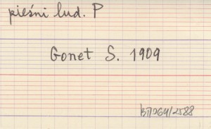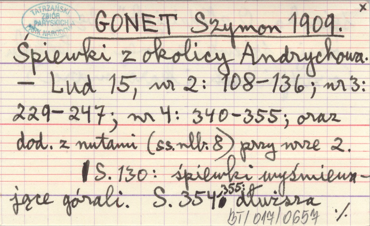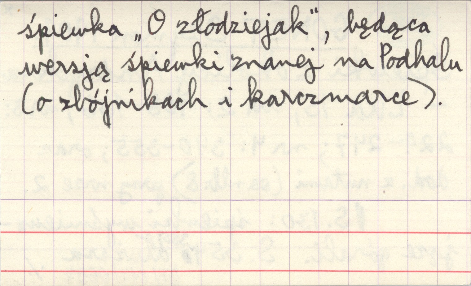 Lud, 15, nr 2: 108-136; nr 3: 229-247; nr 4: 340-355; [8] (nr 2). dodatek z nutami przy nrze 2. S. 130: śpiewki wyśmiewające górali. S. 354-355: dłuższa śpiewka "O złodziejak", będąca wersją śpiewki znanej na Podhalu (o zbójnikach i karczmarce).
