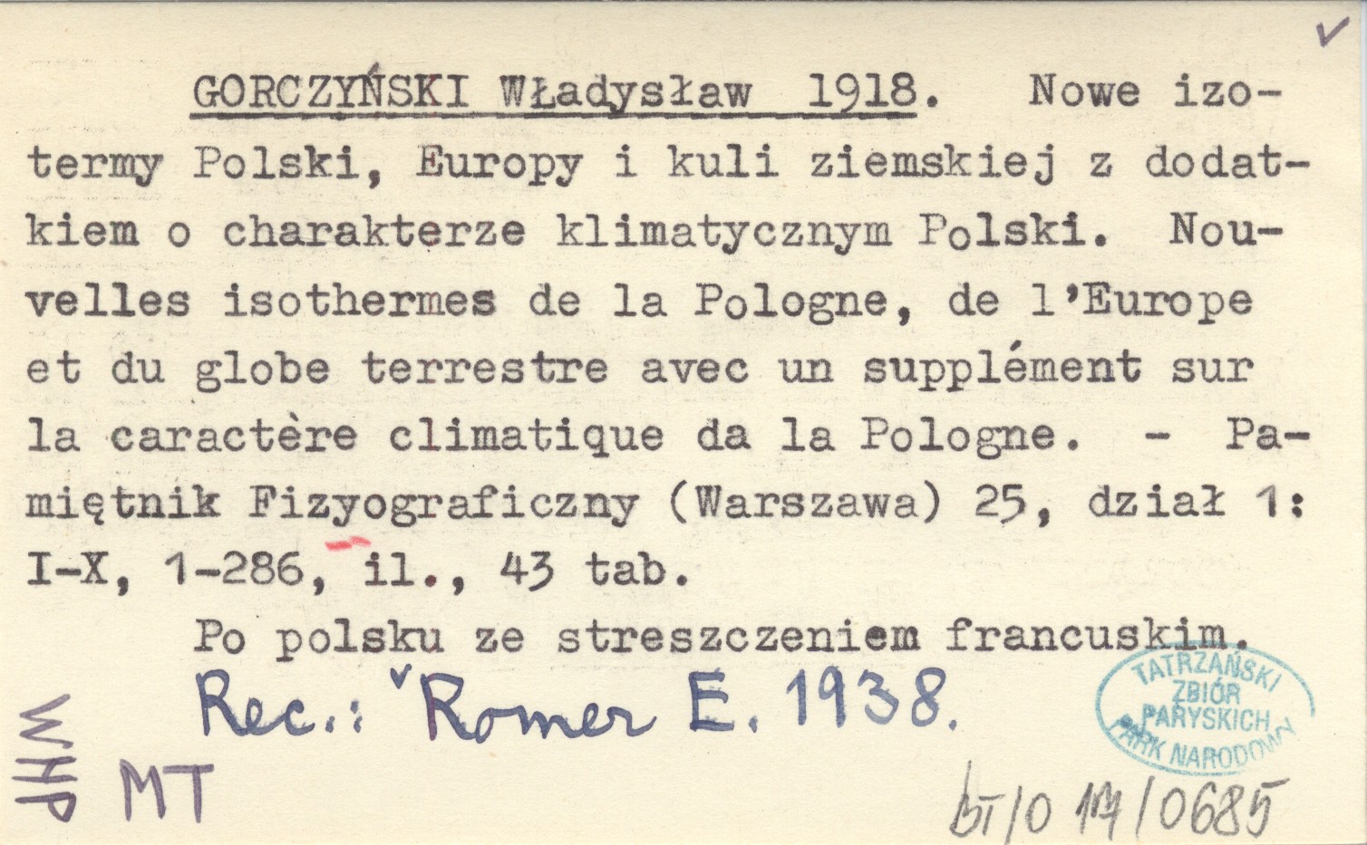GORCZYŃSKI Władysław 1918 Nowe izotermy Polski, Europy i kuli ziemskiej z dodatkiem o charakterze klimatycznym Polski. Nouvelles isothermes de la Pologne, de l'Europe et du globe terrestre avec un supplément sur la caractére climatique da la Pologne.