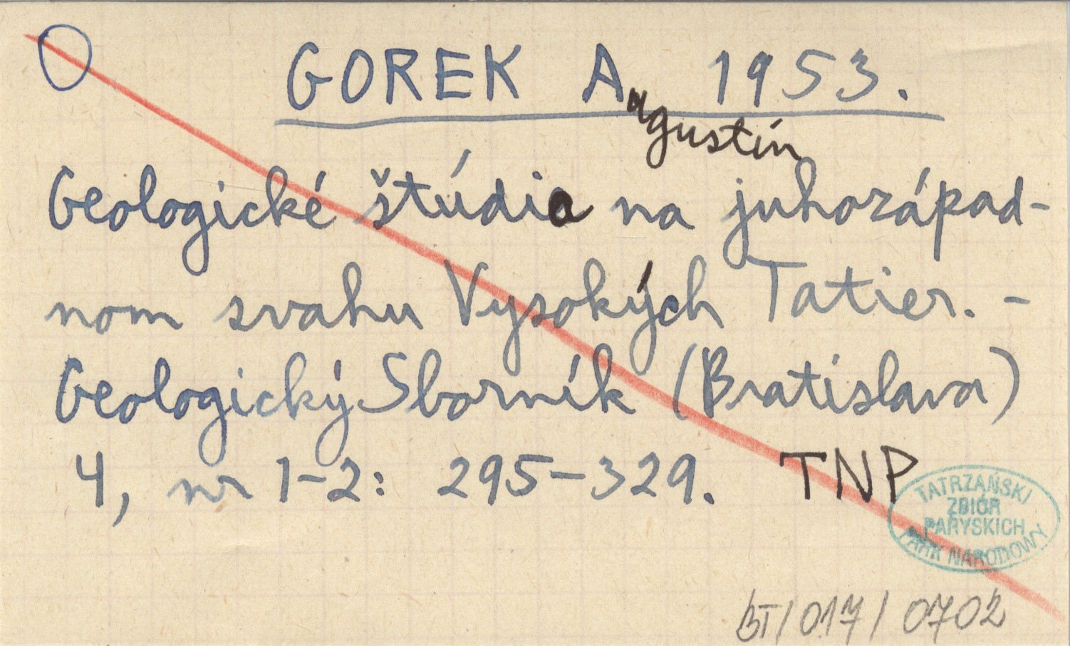 GOREK Augustín 1953 Geologické čtúdia na juhozápadnom svahu Vysokęch Tatier.