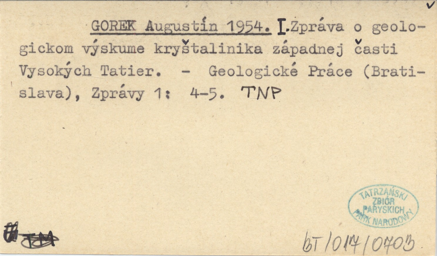 GOREK Augustín 1954 I. Zpráva o geologickom výskume kryštalinika západnej časti Vysokých Tatier.