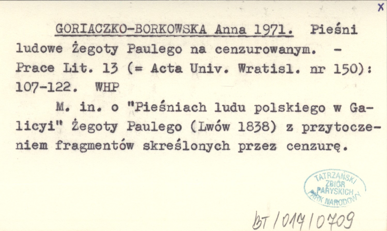 Prace Literackie, 13 (= Acta Univ. Wratisl. nr 150): 107-122. M.in. o "Pieśniach ludu polskiego w Galicyi" Żegoty Paulego (Lwów 1838) z przytoczeniem fragmentów skreślonych przez cenzurę.