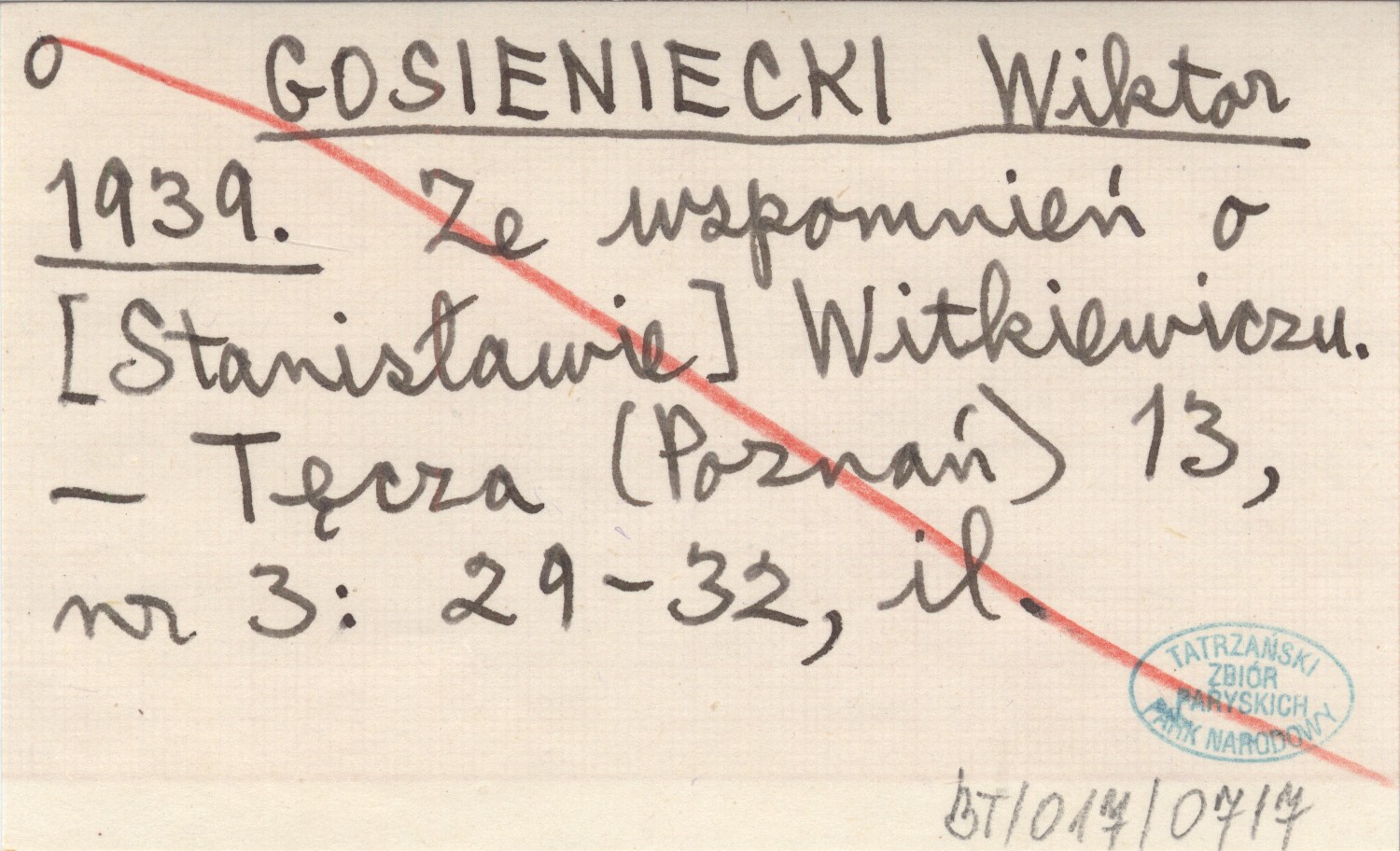 GOSIENIECKI Wiktor 1939 Ze wspomnień o [Stanisławie] Witkiewiczu.