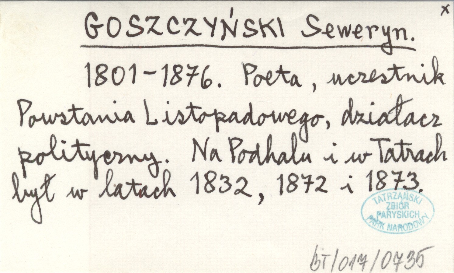1801-1876. Poeta, uczestnik Powstania Listopadowego, działacz polityczny. Na Podhalu i w Tatrach był w latach 1832, 1872 i 1873.