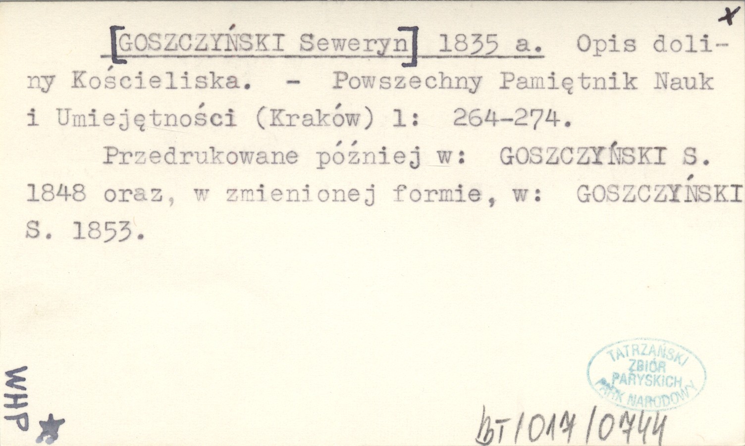Powszechny Pamiętnik Nauk i Umiejętności (Kraków) , 1: 264-274. Przedrukowane później w: GOSZCZYŃSKI S. 1848 oraz, w zmienionej formie, w: GOSZCZYŃSKI S. 1853.