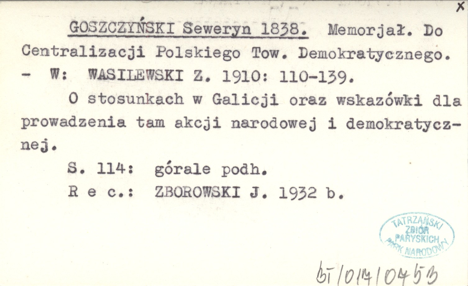 WASILEWSKI Z. 1910. , S. 110-139. O stosunkach w Galicji oraz wskazówki dla prowadzenia tam akcji narodowej i demokratycznej. S. 114: górale podh. REC: ZBOROWSKI J. 1932 b