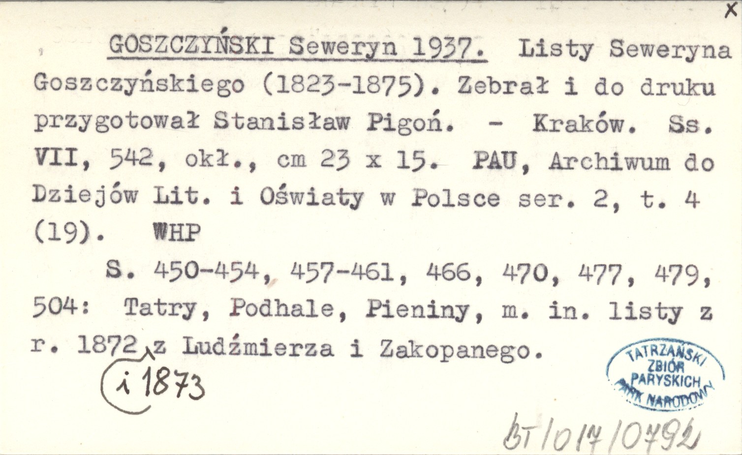 Kraków (PAU, Archiwum do Dziejów Lit. i Oświaty w Polsce, ser. 2, t. 4 (19)) , 7 s., 542, okł., 23x15 cm. S. 450-454, 457-461, 466, 470, 477, 479, 504: Tatry, Podhale, Pieniny, m.in. listy z r. 1872 i 1873 z Ludźmierza i Zakopanego.