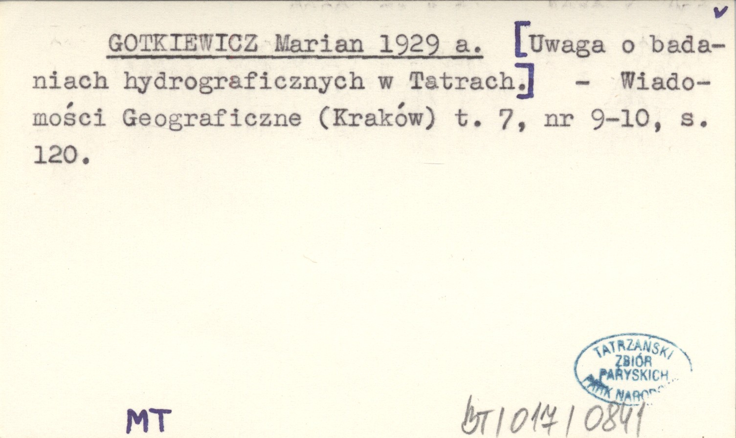 GOTKIEWICZ Marian 1929 a [Uwaga o badaniach hydrograficznych w Tatrach.].