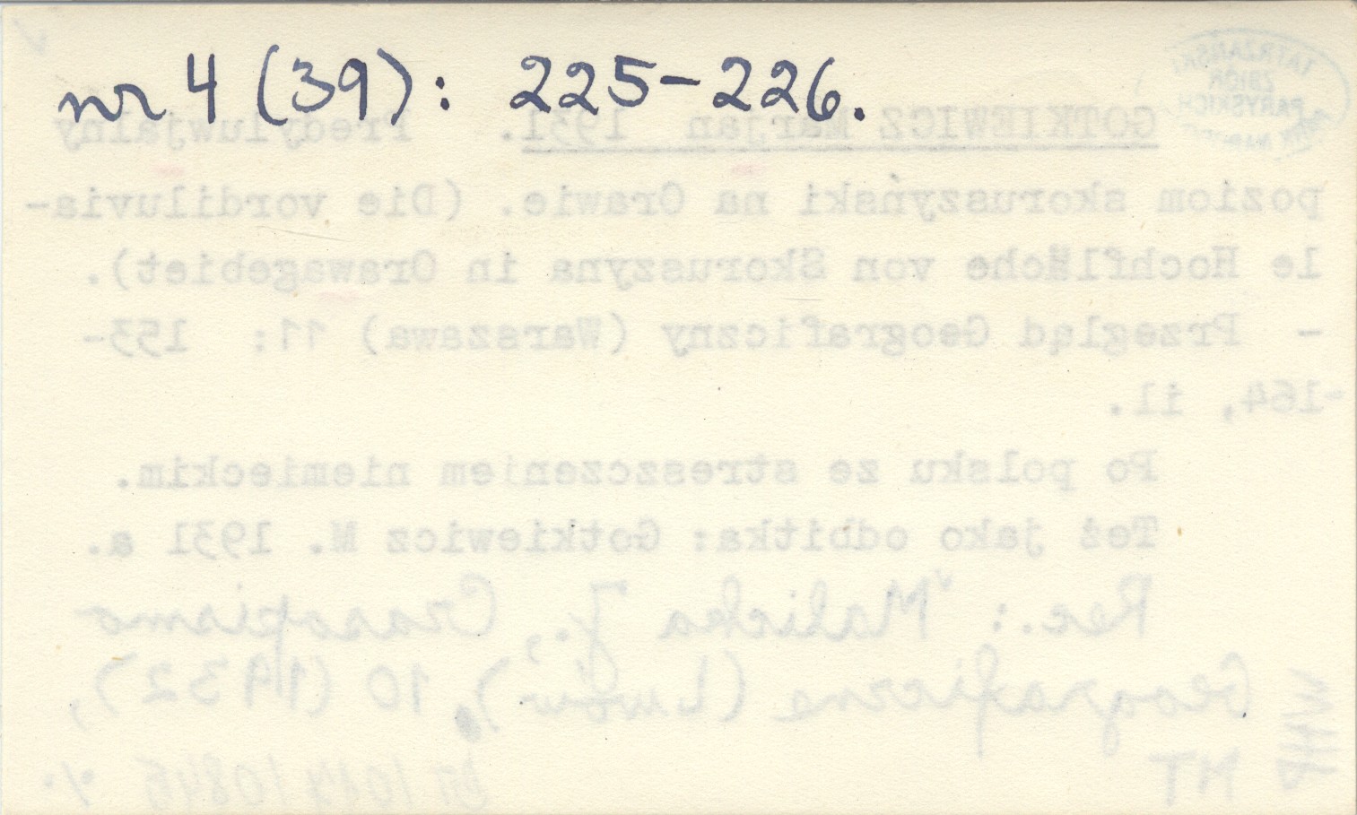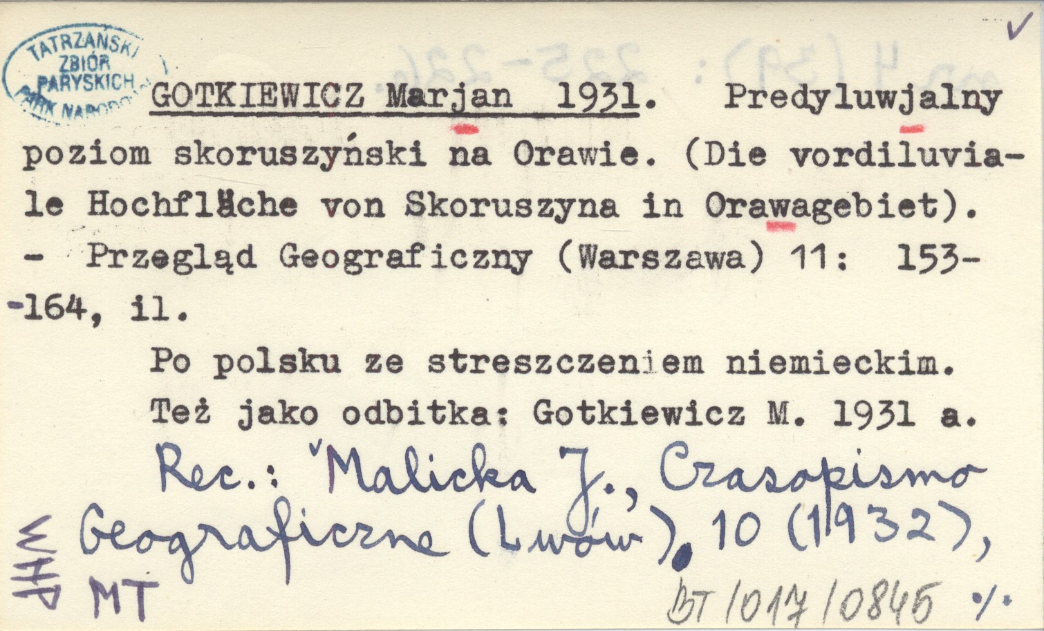 Przegląd Geograficzny (Warszawa) , 11: 153-164, il. Po polsku ze streszczeniem niemieckim. Też jako odbitka: Gotkiewicz M. 1931 a REC: MALICKA J., Czasopismo Geograficzne (Lwów) 10 (1932), nr 4 (39): 225-226.