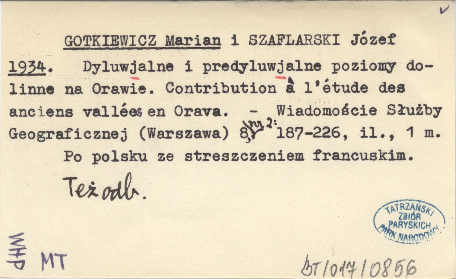 GOTKIEWICZ Marian SZAFLARSKI, Józef. ; 1934 Dyluwjalne i predyluwjalne poziomy dolinne na Orawie. Contribution a l'étude des anciens vallées en Orava.