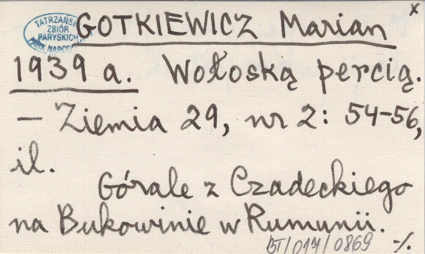 Ziemia, 29, nr 2: 54-56, il. Górale z Czadeckiego na Bukowinie w Rumunii. M.in. o pasterskiej terminologii w Karpatach.