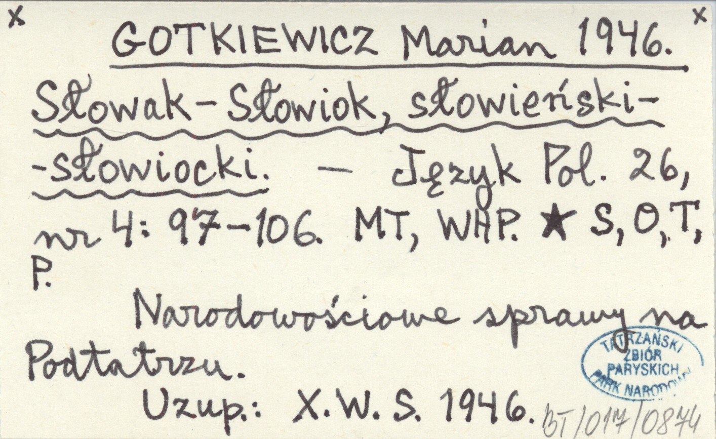 Język Polski, 26, nr 4: 97-106. Narodowościowe sprawy na Podtatrzu. Uzup.: X. W. S. 1946