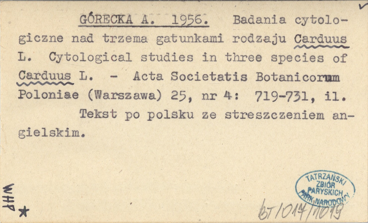 GÓRECKA A. 1956 Badania cytologiczne nad trzema gatunkami rodzaju Carduus L. Cytological studies in three species of Carduus L.