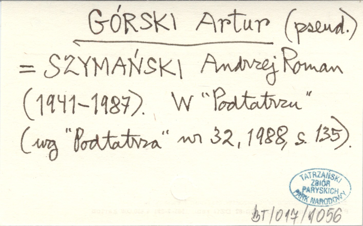 GÓRSKI Artur SZYMAŃSKI Andrzej Roman (1941-1987). W "Podtatrzu" (wg "Podtatrza" nr 32, 1988, s. 135).