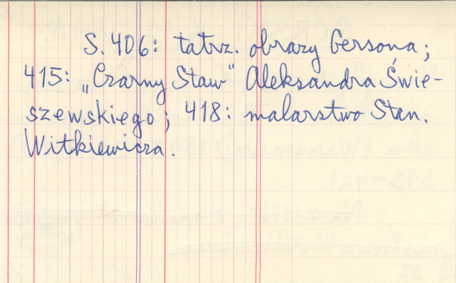 Biblioteka Warszawska (Warszawa) , T. 2 (218): 393-421. S. 406: tatrz. obrazy Gersona; 415: "Czarny Staw" Aleksandra Świeszewskiego; 418: malarstwo Stan. Witkiewicza.