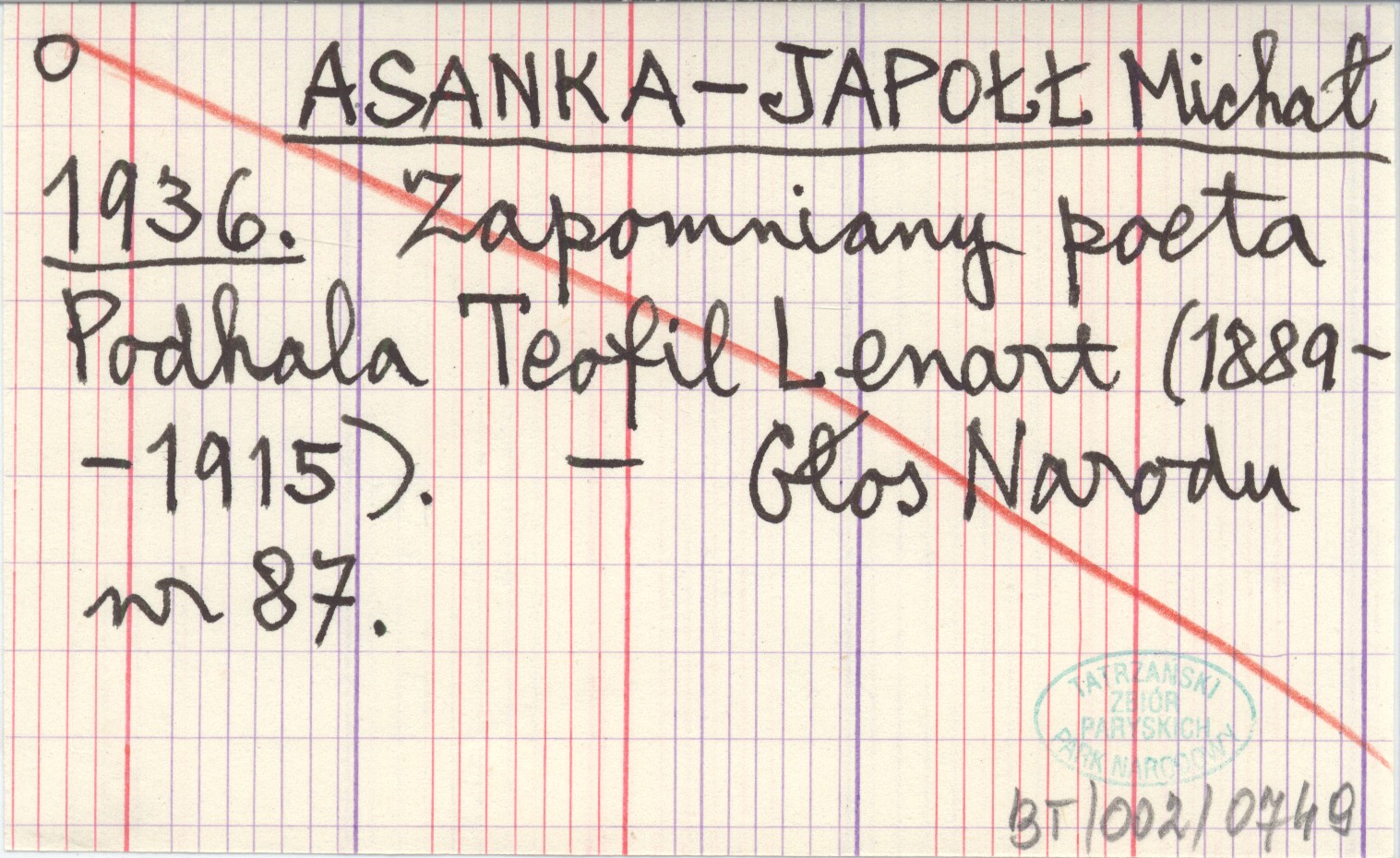 ASANKA-JAPOŁŁ Michał 1936 Zapomniany poeta Podhala Teofil Lenart (1889-1915).