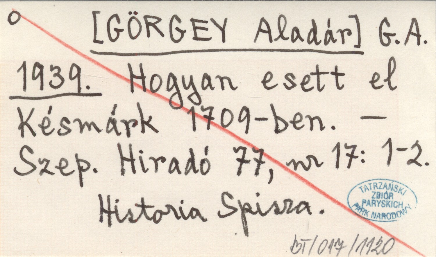 G. A. [GÖRGEY Aladár] 1939 Hogyan esett el Késmárk 1709-ben.