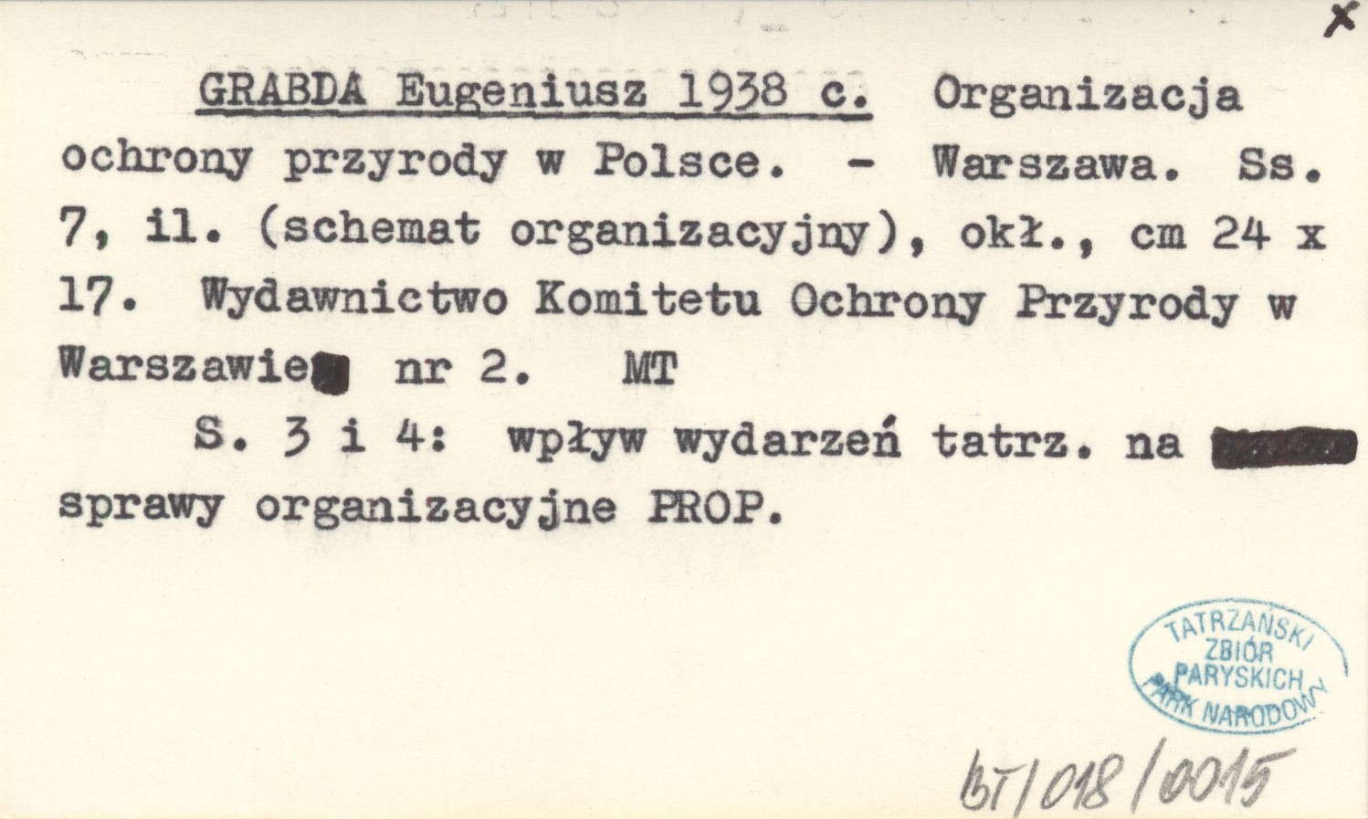 Wydawnictwo Komitetu Ochrony Przyrody w Warszawie nr 2, Warszawa , 7 s., il., okł., 24x17 cm. schemat organizacyjny, s. 3 i 4: wpływ wydarzeń tatrz. na sprawy organizacyjne PROP.