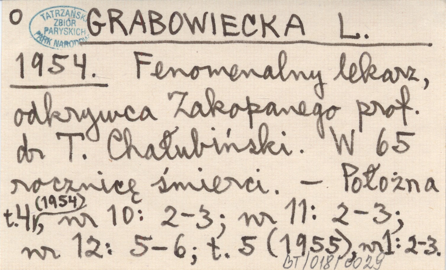 GRABOWIECKA L. 1954 Fenomenalny lekarz, odkrywca Zakopanego prof. dr T. Chałubiński. W 65 rocznicę śmierci.