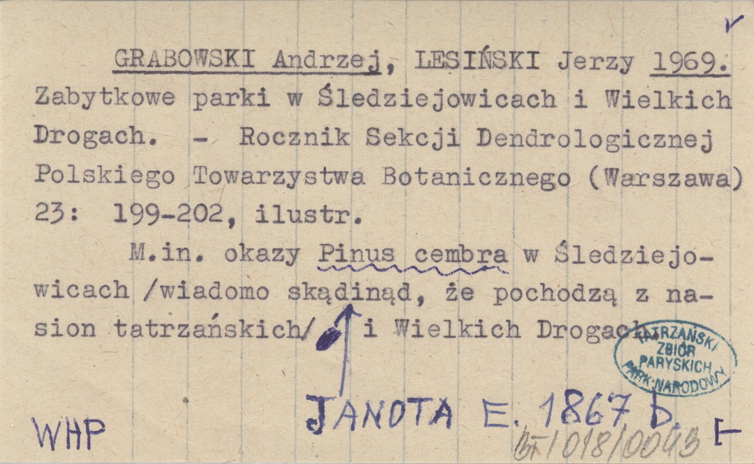 Rocznik Sekcji Dendrologicznej Polskiego Towarzystwa Botanicznego (Warszawa) , 23: 199-202, il. M.in. okazy Pinus cembra w Śledziejowicach (wiadomo skądinąd, że pochodzą z nasion tatrzańskich) i Wielkich Drogach. JANOTA E. 1867 b