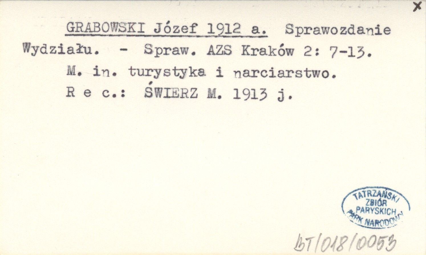 Sprawozdanie AZS (Kraków) , 2: 7-13. M.in. turystyka i narciarstwo. REC: ŚWIERZ M. 1913 j