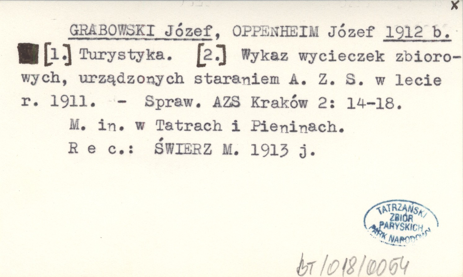 GRABOWSKI Józef OPPENHEIM, Józef. ; 1912 b [1.] Turystyka. [2.] Wykaz wycieczek zbiorowych, urządzonych staraniem A. Z. S. w lecie r. 1911.