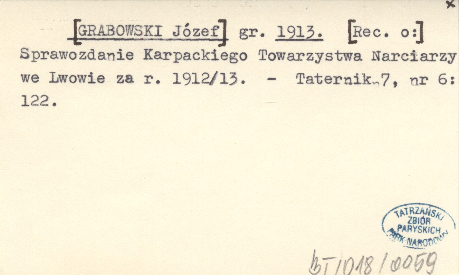 gr. [GRABOWSKI Józef] 1913 Sprawozdanie Karpackiego Towarzystwa Narciarzy we Lwowie za r. 1912/13.
