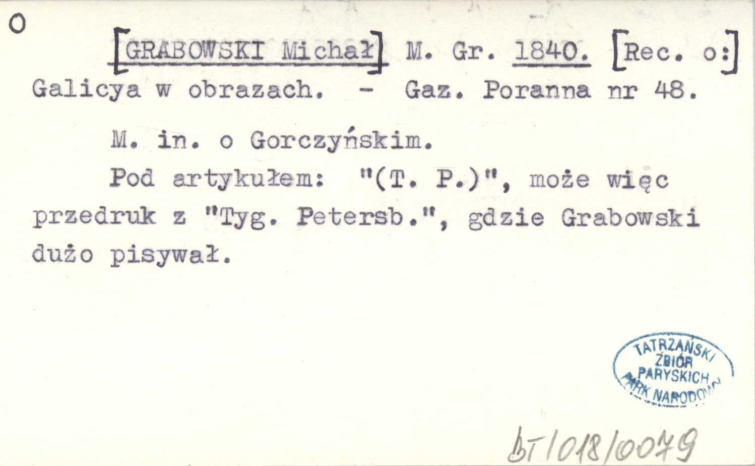 Gazeta Poranna, Nr 48. [Rec. o:] M.in. o Gorczyńskim. Pod artykułem: "(T. P.)", może więc przedruk z "Tyg. Petersb.", gdzie Grabowski dużo pisywał.