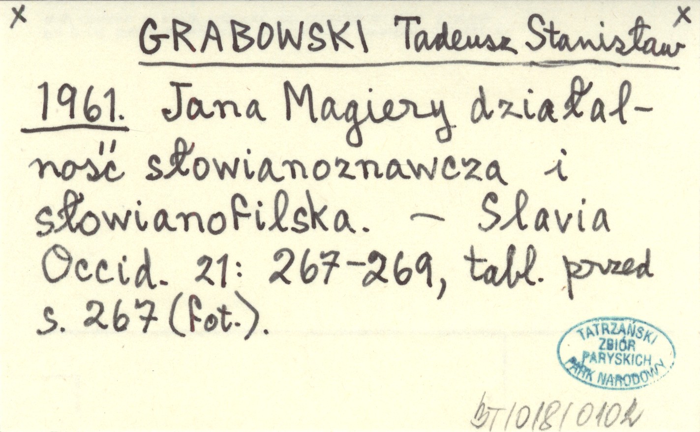 GRABOWSKI Tadeusz Stanisław 1961 Jana Magiery działalność słowianoznawcza i słowianofilska.