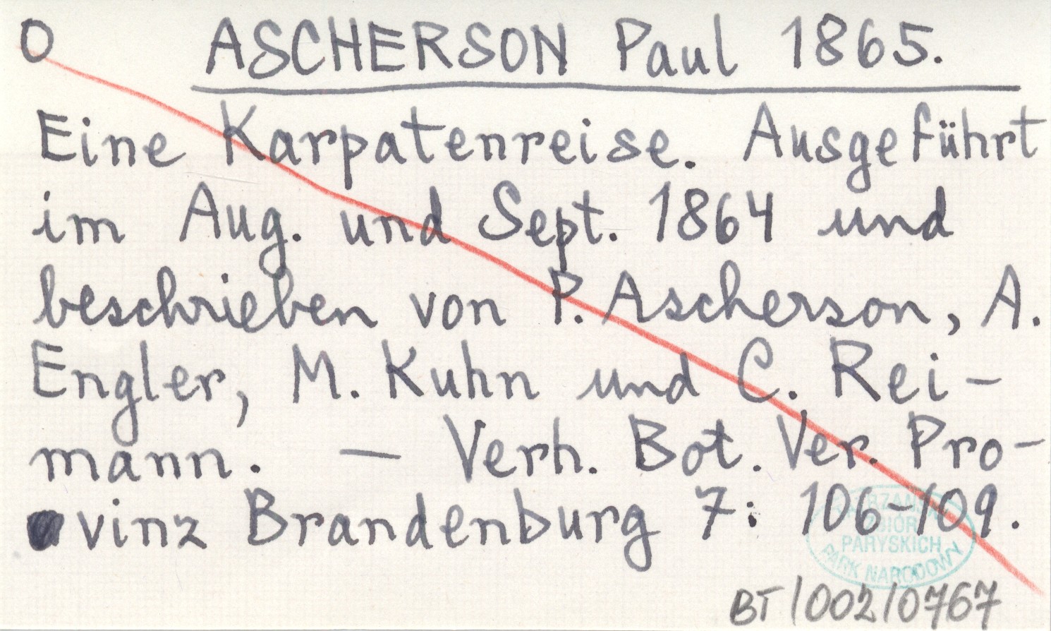 ASCHERSON Paul 1865 Eine Karpatenreise. Ausgeführt im Aug. und Sept. 1864 und beschrieben von P. Ascherson, A. Engler, M. Kuhn und C. Reimann.