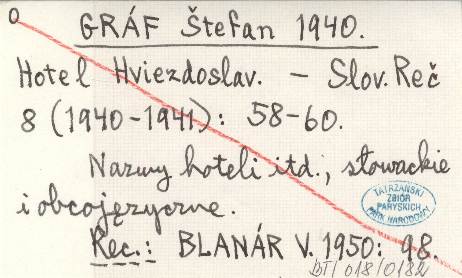 Slov. Reč, 8 (1940-1941): 58-60. Nazwy hoteli itd., słowackie i obcojęzyczne. REC: BLANÁR V. 1950: 98
