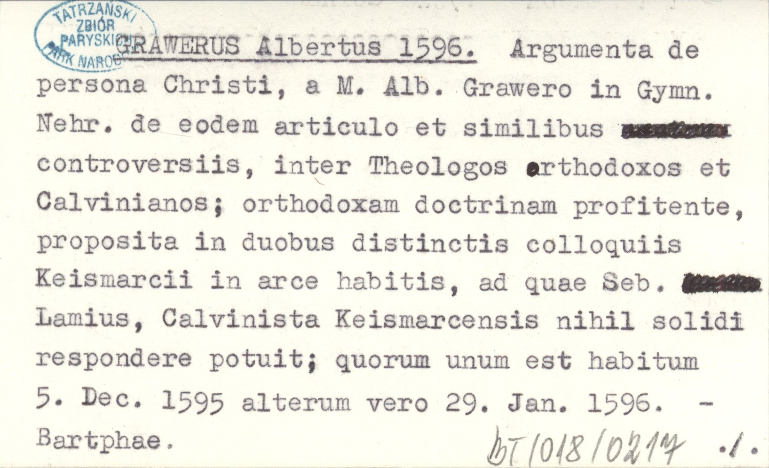 GRAWERUS Albertus 1596 Argumenta de persona Christi, a M. Alb. Grawero in Gymn. Nehr. de eodem articulo et similibus controversiis, inter Theologos orthodoxos et Calvinianos; orthodoxam doctrinam profitente, proposita in duobus distinctis colloquiis Keismarcii in arce habitis, ad quae Seb. Lamius, Calvinista Keismarcensis nihil solidi respondere potuit; quorum unum est habitum 5. Dec. 1595 alterum vero 29. Jan. 1596.