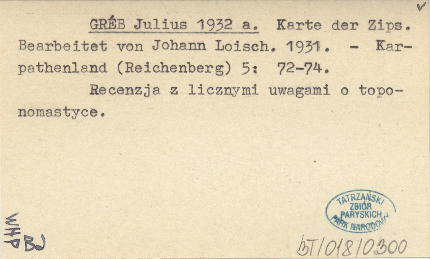 Karpathenland (Reichenberg) , 5: 72-74. Recenzja z licznymi uwagami o toponomastyce.