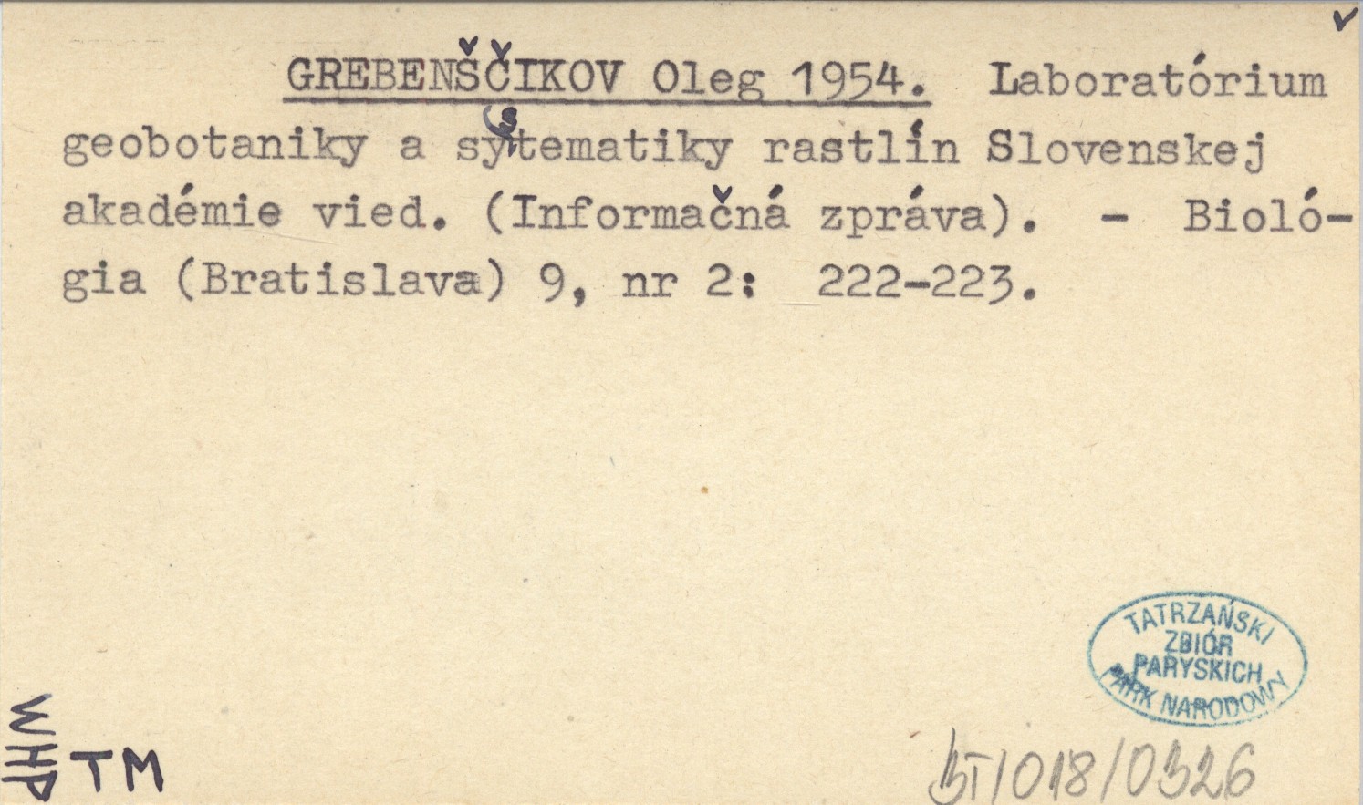 GREBENŠČIKOV Oleg 1954 Laboratórium geobotaniky a systematiky rastlín Slovenskej akadémie vied. (Informačná zpráva).