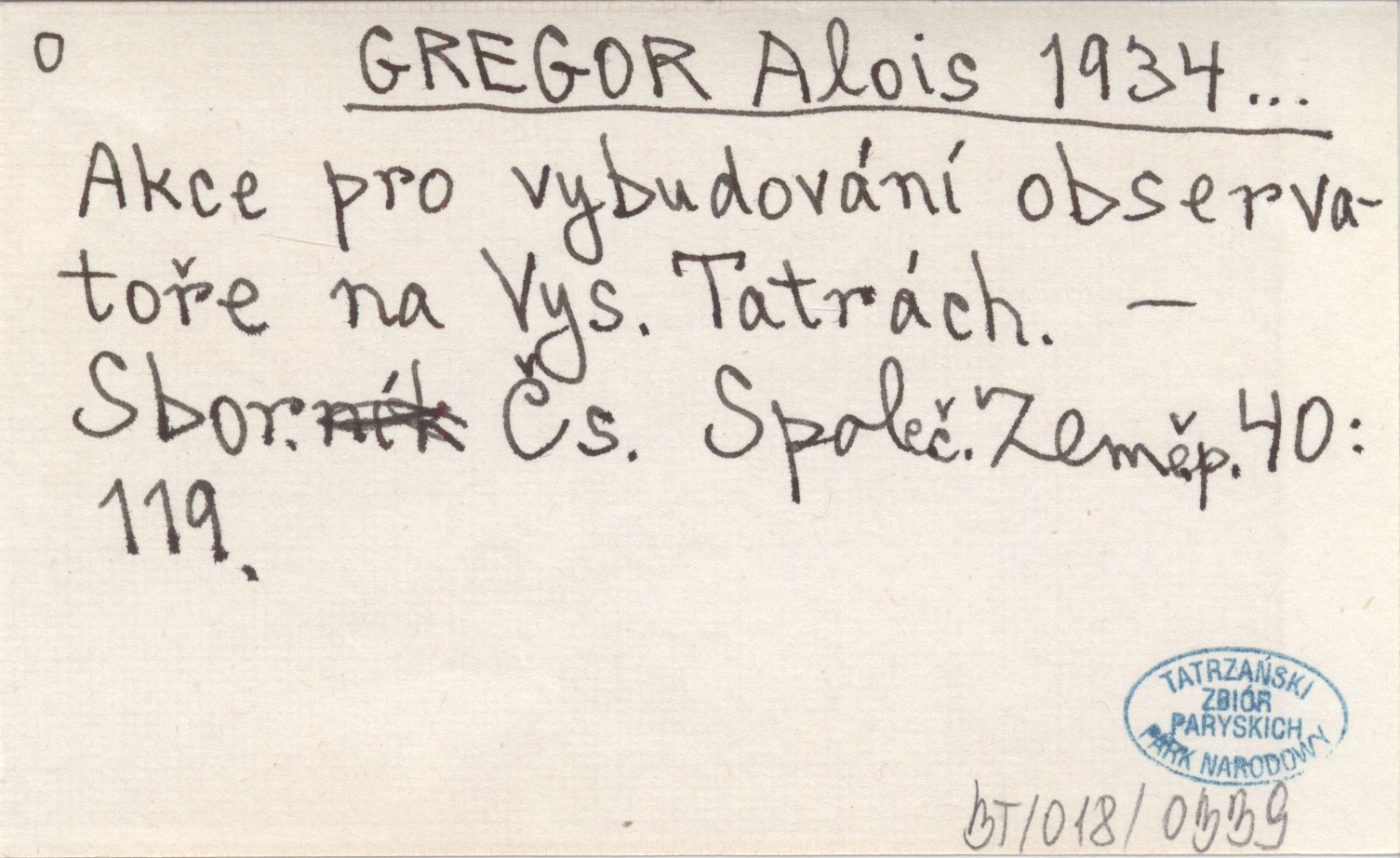 GREGOR Alois 1934... Akce pro vybudování observatoře na Vys. Tatrách.