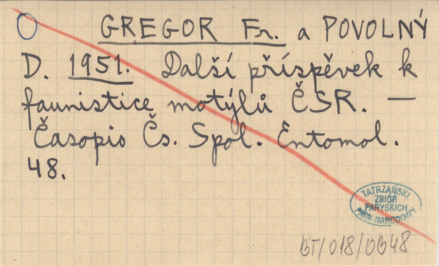 GREGOR Fr. POVOLNÝ, D. ; 1951 Další příspěvek k faunistice motýlů ČSR.