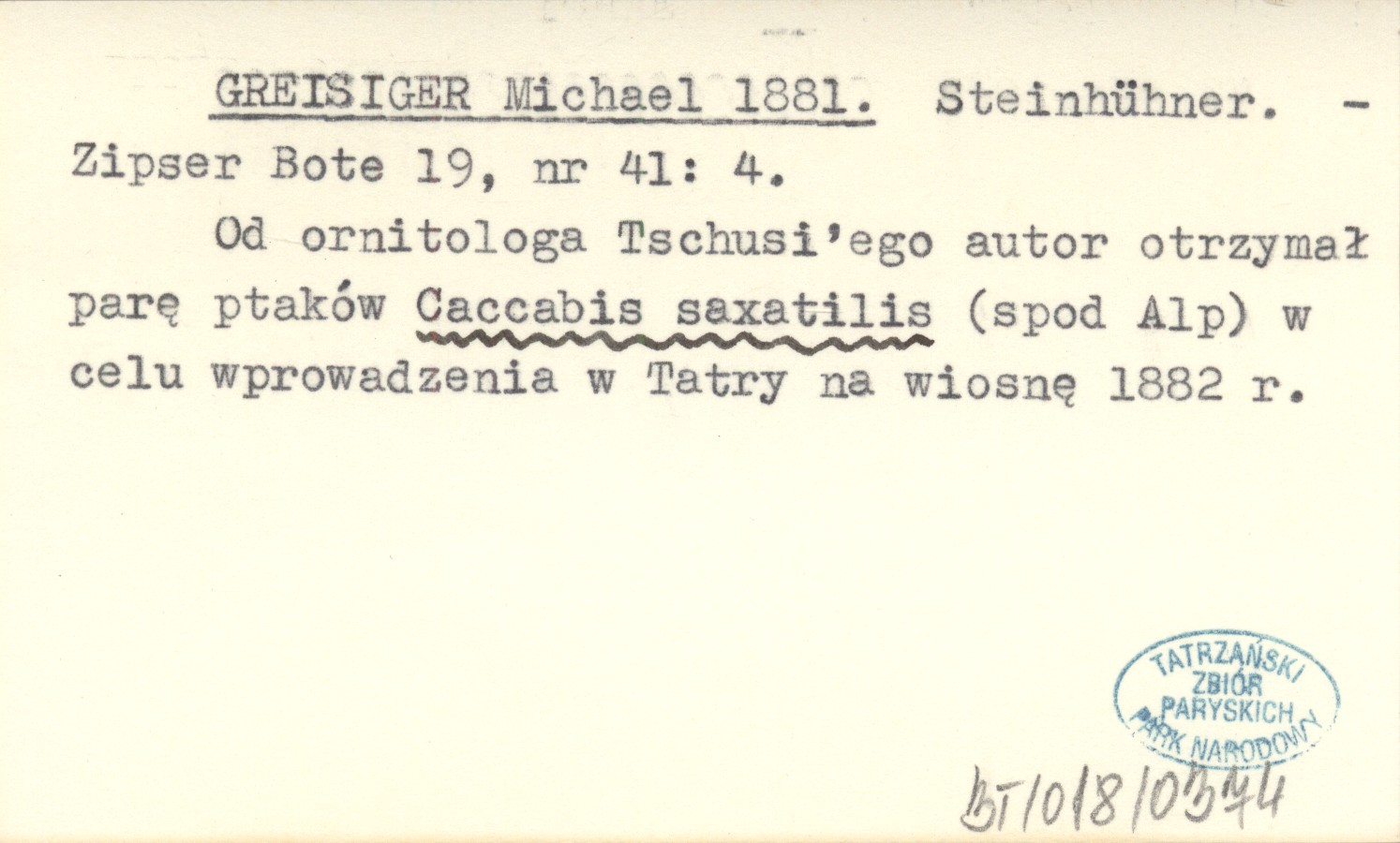 Zipser Bote, 19, nr 41: 4. Od ornitologa Tschusi'ego autor otrzymał parę ptaków Caccabis saxatilis (spod Apl) w celu wprowadzenia w Tatry na wiosnę 1882 r.
