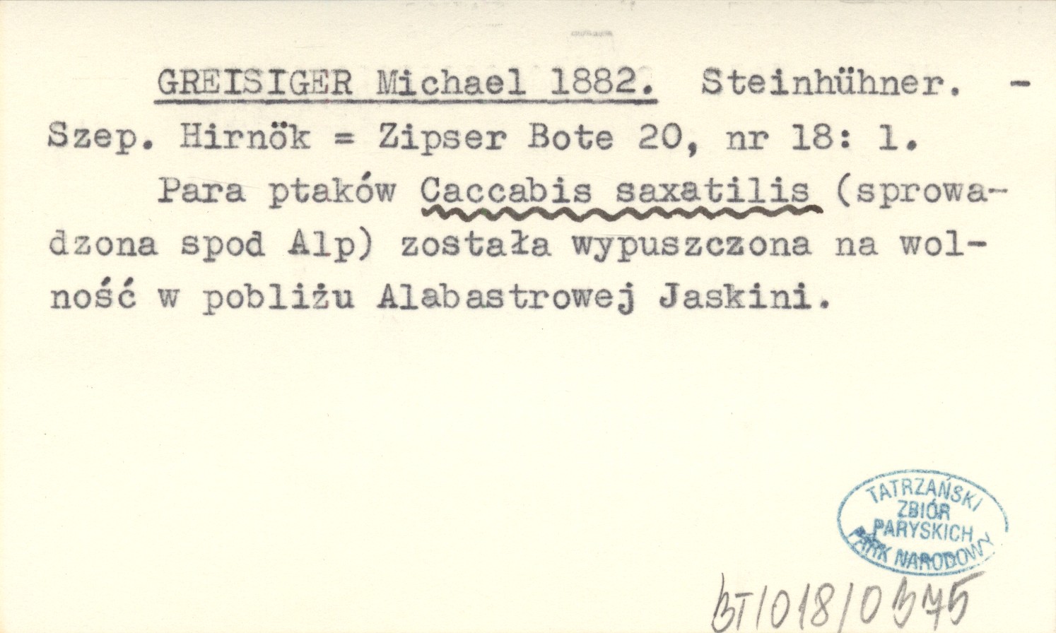 Szepesi Hirnök = Zipser Bote, 20, nr 18: 1. Para ptaków Caccabis saxatilis (sprowadzona spod Alp) została wypuszczona na wolność w pobliżu Alabastrowej Jaskini.