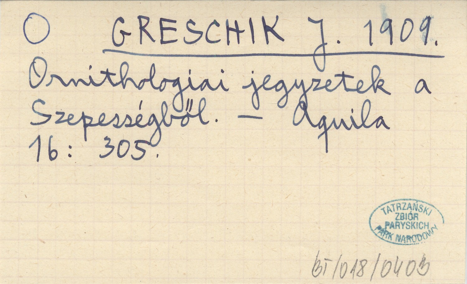 GRESCHIK J. 1909 Ornithologiai jegyzetek a Szepességből.