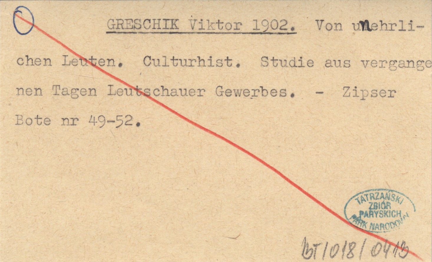 GRESCHIK Viktor 1902 Von unehrlichen Leuten. Culturhist. Studie aus vergangenen Tagen Leutschauer Gewerbes.