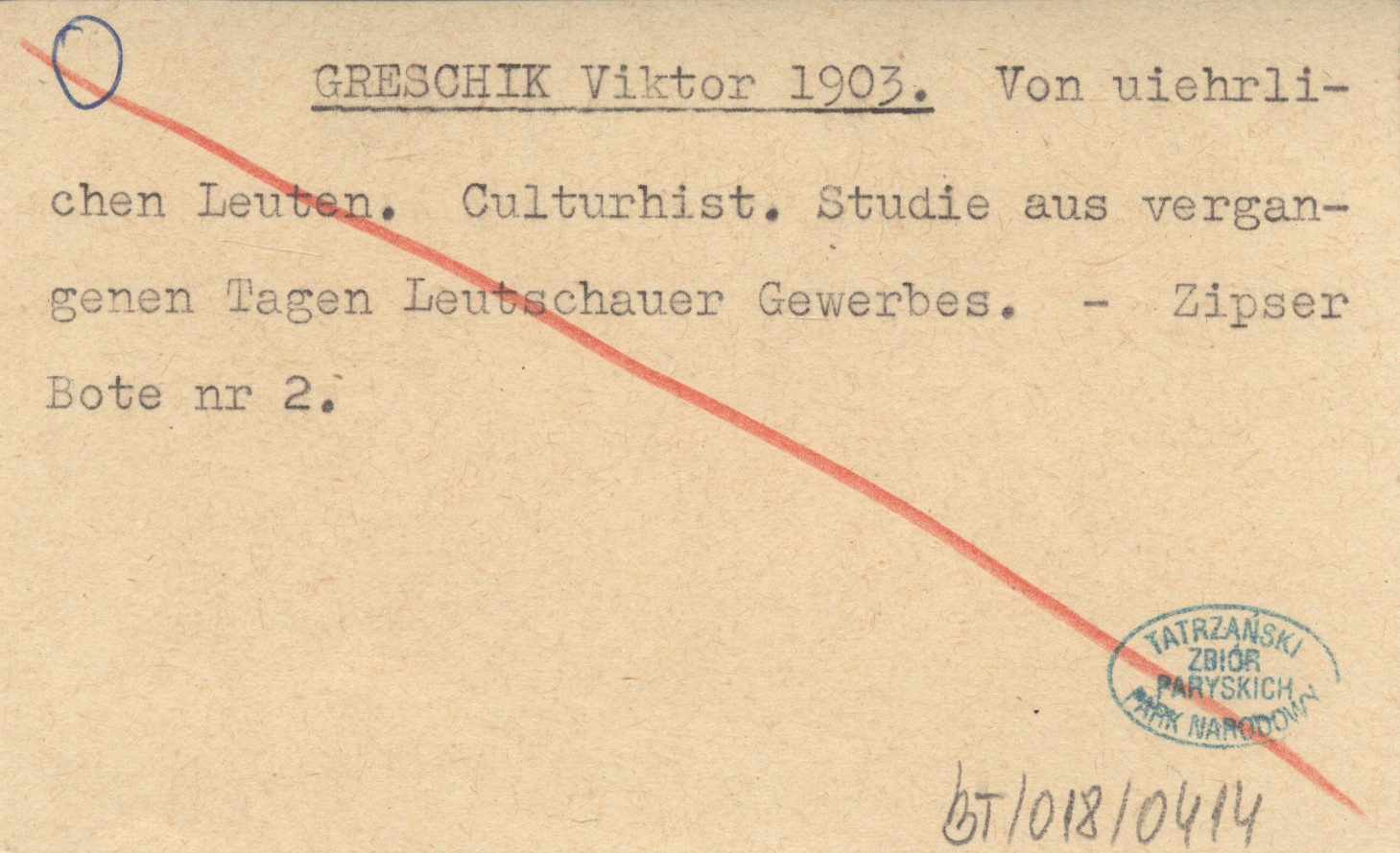 GRESCHIK Viktor 1903 Von uiehrlichen Leuten. Culturhist. Studie aus vergangenen Tagen Leutschauer Gewerbes.