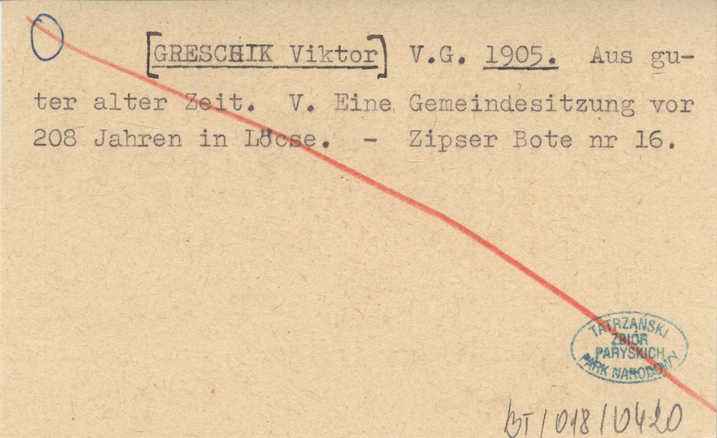V.G. [GRESCHIK Viktor] 1905 Aus guter alter Zeit. V. Eine Gemeindesitzung vor 208 Jahren in Löcse.