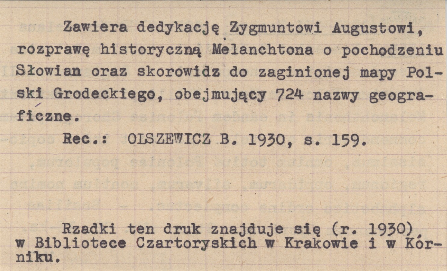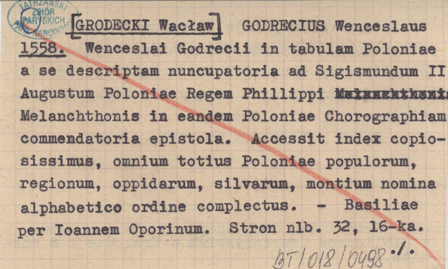 Basiliae per Ioannem Oporinum, [32], 16°. Zawiera dedykację Zygmuntowi Augustowi, rozprawę historyczną Melanchtona o pochodzeniu Słowian oraz skorowidz do zaginionej mapy Polski Grodeckiego, obejmujący 724 nazwy geograficzne. Rzadki ten druk znajduje się (r. 1930) w Bibliotece Czartoryskich w Krakowie i w Kórniku. REC: OLSZEWICZ B. 1930, s. 159