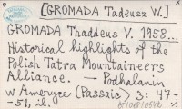 GROMADA Thaddeus V. [GROMADA Tadeusz W.] 1958... Historical highlights of the Polish Tatra Mountaineers Alliance.