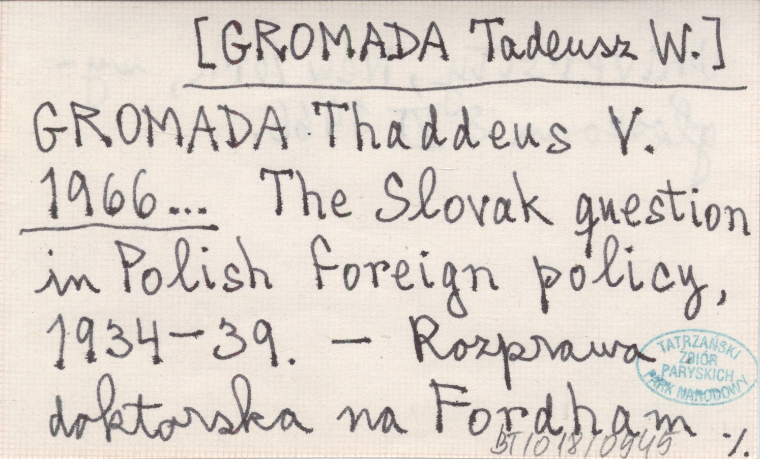 GROMADA Thaddeus V. [GROMADA Tadeusz W.] 1966... The Slovak question in Polish foreign policy, 1934-39.