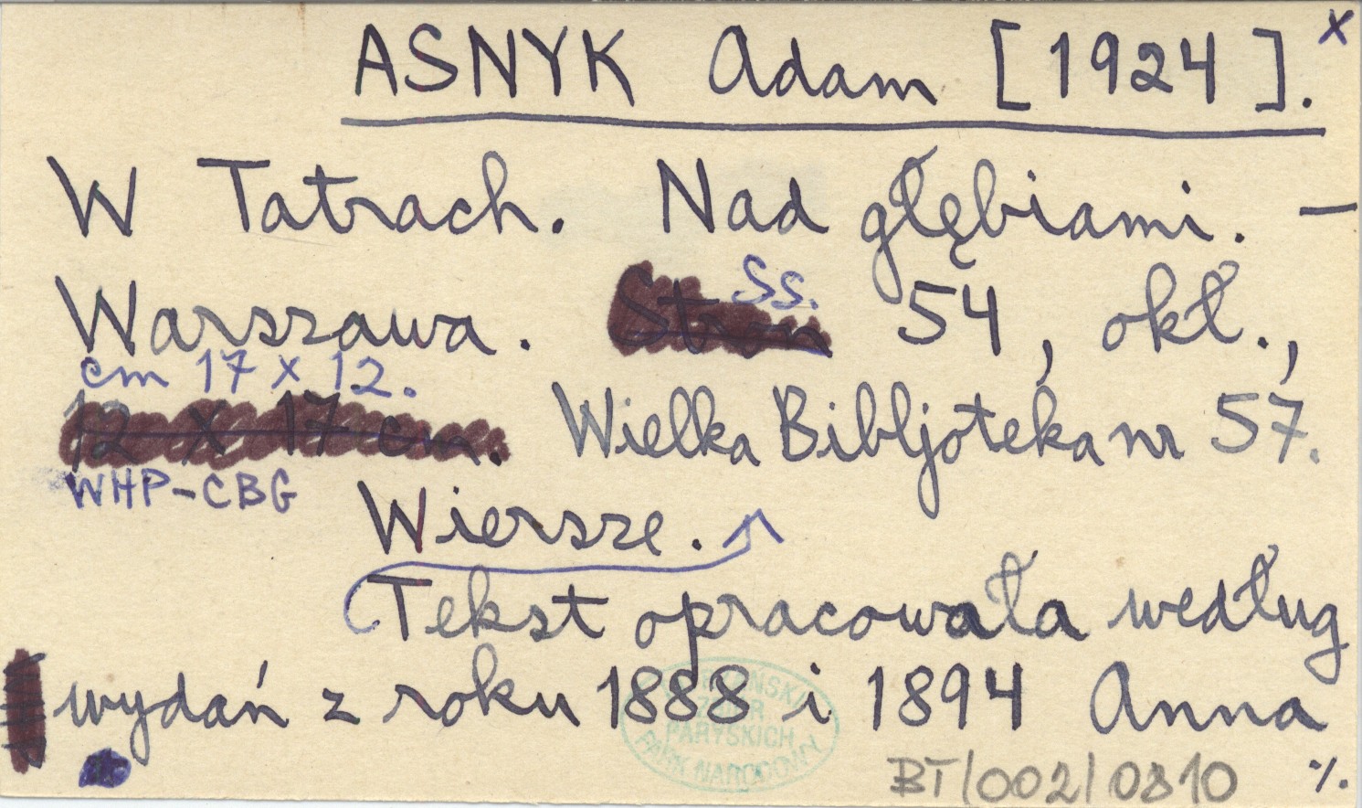 Warszawa , 54 s., okł., 17x12 cm. Wiersze. Tatry: s. 5-33 (cykl W Tatrach). Wielka Bibljoteka nr 57. Tekst opracowała według wydań z roku 1888 i 1894 Anna Chorowiczowa.