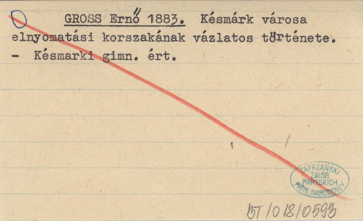 GROSS Ernő 1883 Késmárk városa elnyomatási korszakának vázlatos története.