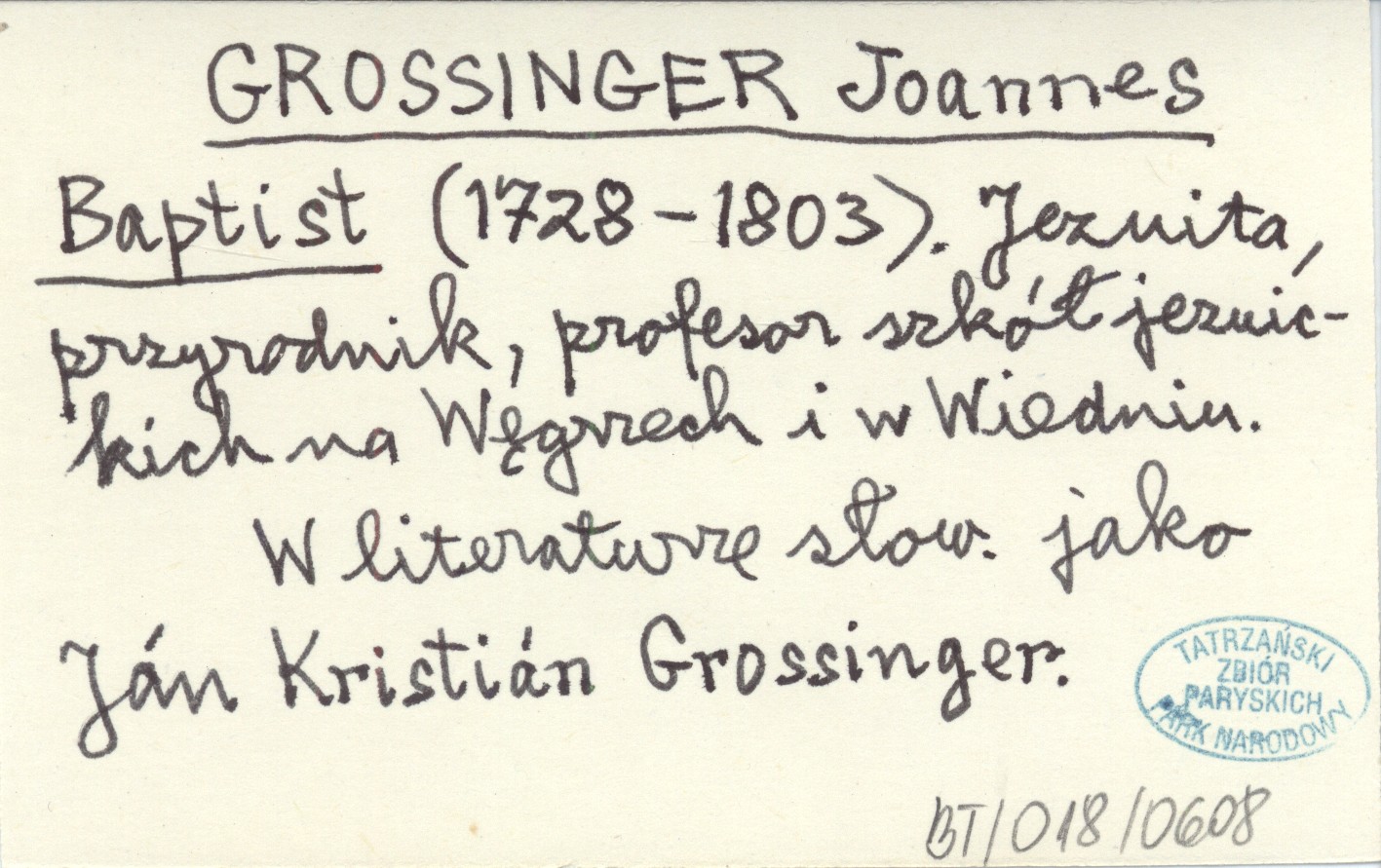 (1728-1803). Jezuita, przyrodnik, profesor szkół jezuickich na Węgrzech i w Wiedniu. W literaturze słow. jako Ján Kristián Grossinger.