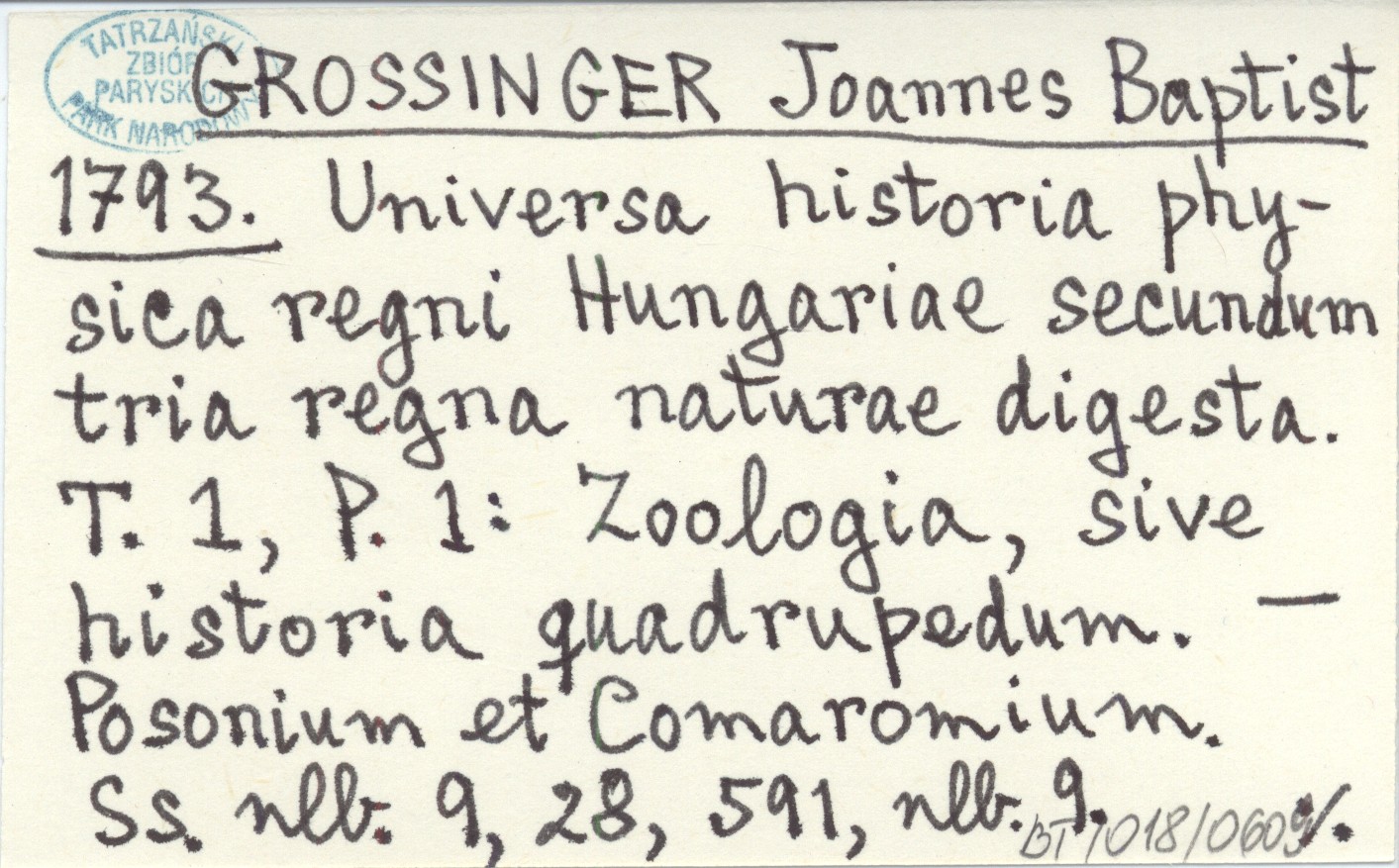 GROSSINGER Joannes Baptist 1793 Universa historia physica regni Hungariae secundum tria regna naturae digesta. T. 1, P. 1: Zoologia, sive historia quadrupedum.