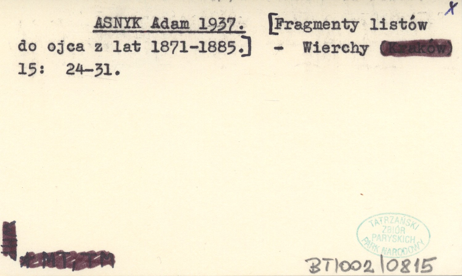 ASNYK Adam 1937 [Fragmenty listów do ojca z lat 1871-1885.]