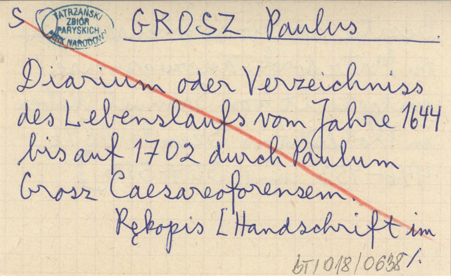 GROSZ Paulus Diarium oder Verzeichniss des Lebenslaufs vom Jahre 1644 bis auf 1702 durch Paulum Grosz Caesareoforensem.